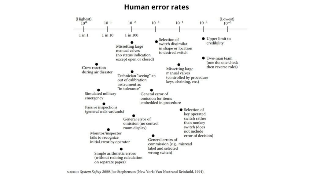 Dalam situasi terbaik sekalipun, tingkat kesalahan manusia hanya bisa ditekan hingga satu kesalahan dalam setiap 10.000 percobaan, atau sekitar 100 kesalahan per juta (parts per million).