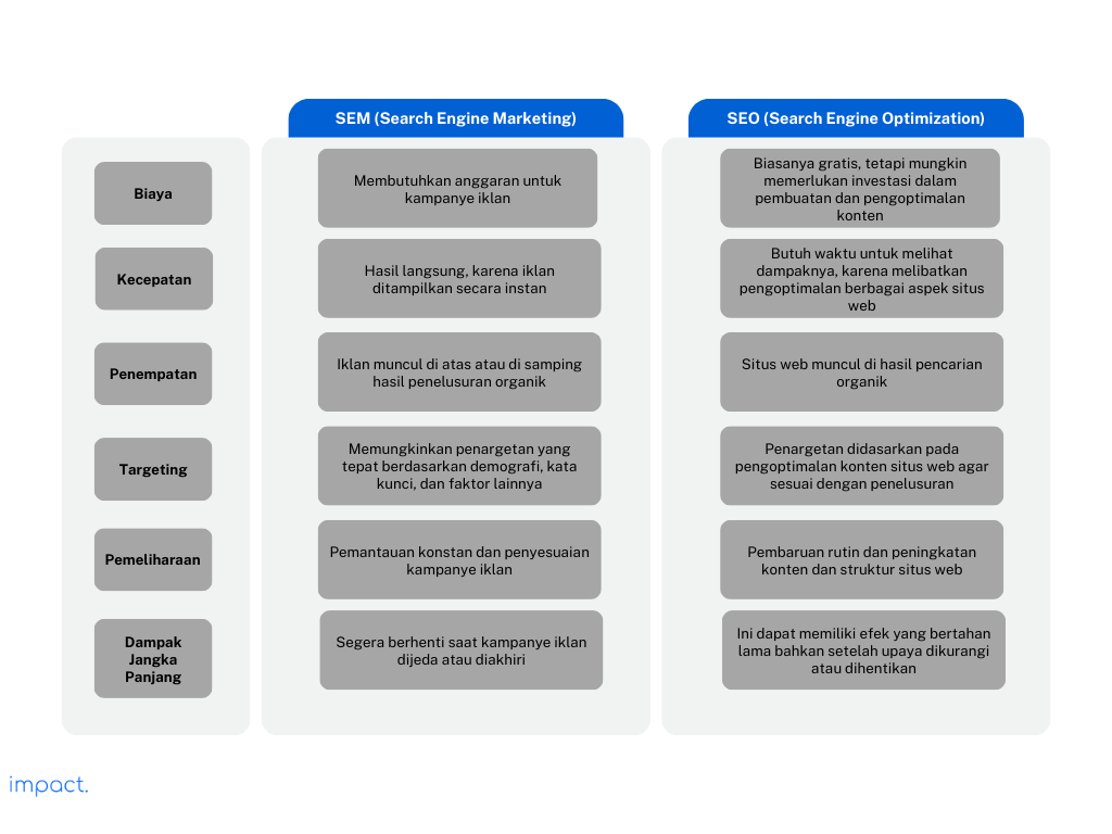 Sementara itu, SEM adalah strategi pemasaran digital yang melibatkan biaya untuk meningkatkan visibilitas produk atau layanan Anda di halaman hasil pencarian. SEM mencakup iklan berbayar seperti Google Ads yang muncul di bagian atas atau bawah hasil pencarian untuk kata kunci tertentu.