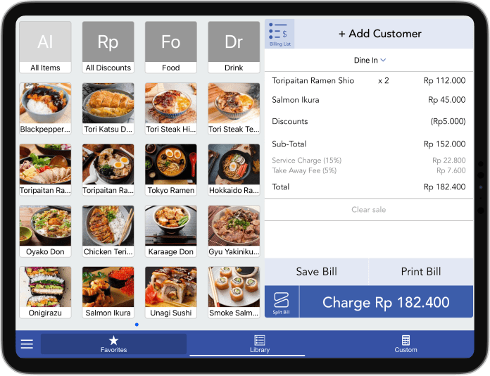 Save Bill/Split Bill: Memungkinkan pemisahan tagihan atau pesanan tambahan dengan mudah, ideal untuk pelanggan yang datang berkelompok.