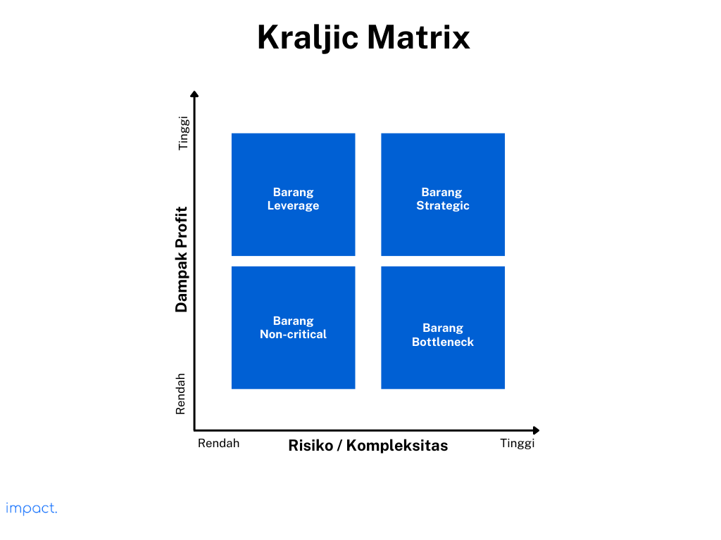 Metode populer lainnya yang bisa digunakan untuk mengelompokkan pemasok lebih jauh adalah Kraljic Matrix. Metode ini memungkinkan perusahaan untuk mengkategorikan pembelian berdasarkan risiko dan nilai strategis kepentingan bisnis.